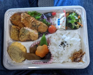 こちら、 昨日のロケ弁です。魚フライ弁当。 移動中のロケバスの中で、美味しく有り難くいただきました。 |