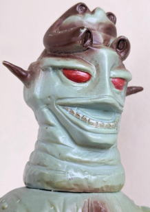 ミニサイズの人形も、当時、発売されていました。 どちらも、タカトク製で、全長約9センチ。 小さいから・・・、とナメてはいけません。 勝手に黒目を描き込んじゃってる、 前述のブルマァクのスタンダードサイズの人形と違い、 こちらは実物に寄せた目にしてある分、不気味さが際立ち、 絶対に友好的ではない相手である事が一目で判かります。 山椒は小粒でもピリリと辛い・・・、そんなソフビです。 |