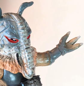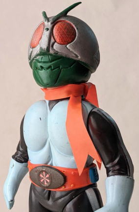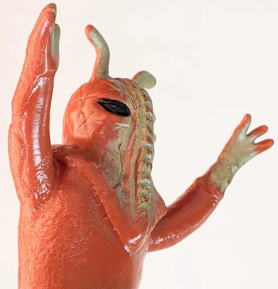 ・・・ただ、 そういう、残念さが、 実は “醍醐味”、つまり “堪らない魅力” だったりするところが、昭和ソフビの面白いところ、なンですよね。 実物の怪獣・怪人をそっくりそのまま完璧にコピーしていないところに、 夢が隠れている、というか、楽しみが潜んでいる、というか、ちょうど俳句の行間のような “想像する余地” が、残されてるンです。 世代が違う人は、あまりピンと来ないかもしれませんが、 僕らは、そういう “造形の妙” みたいなものを、幼心に、理屈でなく感覚で理解していたンだと思うンですよね。 実際にそれらの人形で自由に夢や空想を膨らませて遊び、胸をときめかせてましたから・・・。 なので、 その、気の利かない、なんだかちょっと鈍臭い感じ、 “孫の手” の話に掛けて言うと、 “痒いところに手が届かないもどかしさ” ・・・みたいなものがある懐かしの造形が、 大人になった今、とても麗しく、そして、切ないまでに愛おしいのであります。 ・・・ソフビの奥深いところです。 ![]() |