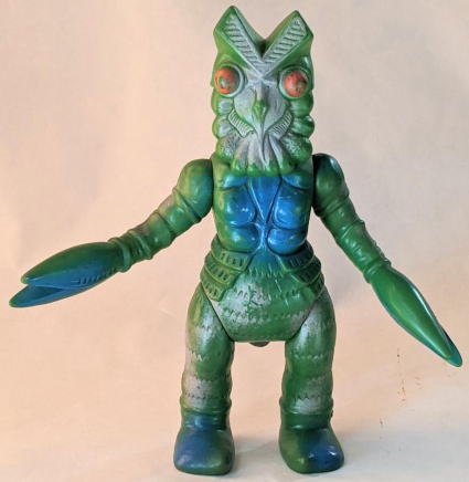 けれども、 ブルマァク版は、サイズが充実。 マルサン版とは異なり、上記のスタンダードサイズ以外にも、 ジャイアントサイズ、ミニサイズ、ミドルサイズのバルタン星人人形が発売されていました。 順次、紹介させていただきましょう。 まずは、ジャイアントサイズ。 |