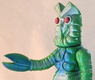全長約36センチ、と迫力満点で、 商品名も “ジャイアントバルタン星人” と、デカさを強調していました。 けれどもハサミは小さめ。この “解かって無さ” が、昭和玩具の “味” ですね(笑)。 |