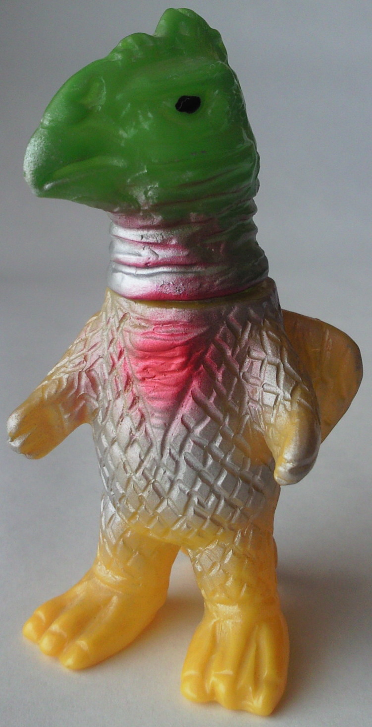 | 3体とも、全長約10センチ。 向かって左端と真ん中の2体がブルマァク製で、 右端のド派手な彩色の人形は海賊版です。 手に乗せて、餌をあげたくなっちゃいます(笑)。 |