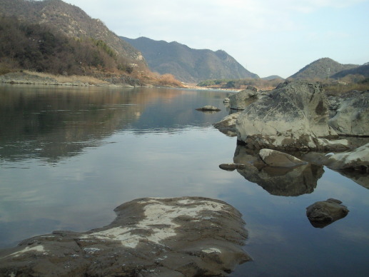 | 川上の方を眺めていると、 今にも本当に、 大きな桃が、 どんぶらこ、どんぶらこ、 と流れてきそうな気がしてきます。 |