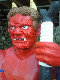 そういえば、 神社の入り口付近に建ってるこの鬼、 45年前に僕が来た時は、全身が青い色をしていました。 すべての像が 劣化防止のため塗り替えられているようですが、 青鬼から赤鬼に塗り替える、 というのは、 いただけませんなぁ・・・。 それぞれ性格も異なる、別個のキャラクターですから。 だって、 『アクマイザー3』で言ったら、 アオニーダがアカニーダになっちゃう、って事だよ。 ダメでしょ、そりゃあ(笑)。 |