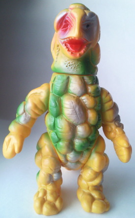 | これは、 先述のブルマァク製スタンダードサイズの復刻版。 ブルマァク倒産後、 円谷エンタープライズから、昭和55~57年の間に発売されています。 ただ、 倒産前から既にこのカラーリングで売られていた、という説もあり、 もしかしたら、復刻版ではなくて、 “後期”・“成型色違い”という、れっきとしたブルマァクソフビかもしれません。 |