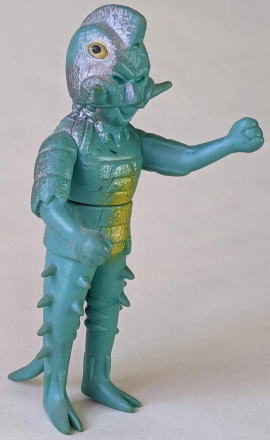 以前、第65回「最後のチャンバラ世代」の中でもチラッと紹介した人形ですが、 敵キャラがソフビ人形として商品化された例は、 ウルトラシリーズとライダーシリーズ以外の作品では極めて少なく、 主役のヒーローのみしか商品化されていない場合がほとんどなので、 こういう、子供の時に毎週『快傑ライオン丸』を観ていた同世代の飲み仲間たちでさえ その存在をまったく憶えていない・・・、 なんていうマイナーな敵キャラが、 ちゃんとソフビ人形になってる、って事態は、コレクターにとって、とても嬉しい事です。 ![]() |
