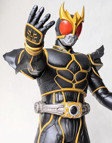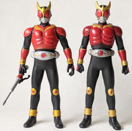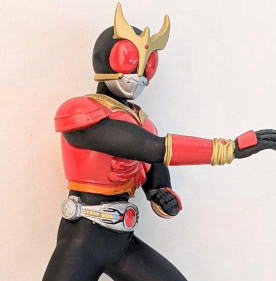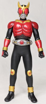 そして、これは、 平成12年の暮れに、 小学館の児童向け雑誌『てれびくん』の誌上において限定販売されたソフビ。 仮面ライダークウガ・アルティメットフォーム とく大リアルフィギュア。 バンダイ製、全長約38センチ。 この商品が入っていた箱には、 商品の写真と一緒に、 たいせつにあそんでね!! ってメッセージが印刷されていたのですが、それを読んで、 こんな硬質ソフビの トッキントッキン(名古屋弁で、鋭く尖った様を指す言葉です)に尖った部分がある人形なんかで、 子供を遊ばせられるかぁ! って思った事を憶えています。 |