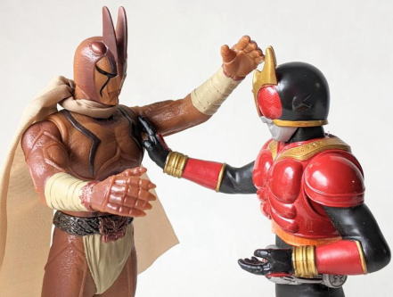 これは、 クレーンゲームの景品。 仮面ライダーコレクタブルソフビフィギュア(平成15年、バンプレスト製)、全長約17センチ。 |