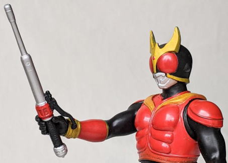 番組放映時に発売されたもので、全長約17センチ。 トライアクセラー (クウガのバイク・トライチェイサー2000の右ハンドルにもなる機体始動キー)が、付属してました。 ![]() |