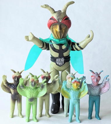『仮面ライダー』第5話「怪人かまきり男」に登場した、かまきり男です。 本郷猛(すなわち仮面ライダー)の命を狙い、 更には、地下に配置した核爆弾を “かまきりの卵” なる起爆装置で作動させ、 人工地震を起こして都市を壊滅させようとする、 とんでもなく悪いヤツです。 とんでもなく悪いヤツですけど、 やっぱ、“昆虫の改造人間” という神秘的な不気味さに魅了され、 子供の頃(番組放映時の昭和46年~48年)、ソフビ人形を買ってもらって 夢中で遊び倒しましたし、 大人になってからも、下記のように、その当時のものを、 夢中で(笑)集めている次第です。 |