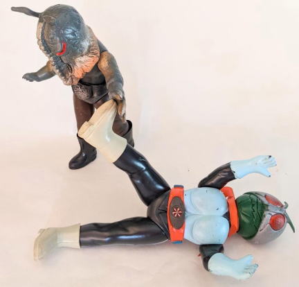 | そんな、なんだか遠慮がちな造形の鉤爪のせいで、 スタンダードサイズのアリガバリ人形もミニサイズのアリガバリ人形も、 とても、ショッカーの歴史にその名を遺す強敵怪人には見えません。 もう一度言いますが、 アリガバリの大きな左手の長い鉤爪は、 ライダーキックを跳ね返した爪、 なンですから。 それを喰らったらほとんどの怪人は絶命してしまう、あのライダーキックを、 アリガバリは、その片手の爪だけで撥ね退けたンですからね。 そんな、最も強調すべき箇所を、控えめに表現されては困ります。 |