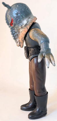 | それに、 そもそも、鉤爪になってないですし・・・。 これは不満です。 アリガバリの見目形のもう一つの特徴である長い口は、 このように、 頭部パーツを全体のバランスなど一切気にせず大きくして、 口先がベルトのバックルに 届くか届かないかの位置にあるかのように表現し、 実物の魅力を盛りに盛って伝えているのですから、 そんな昭和ソフビの真骨頂であるデフォルメ表現を、 左手の長い鉤爪でも存分に発揮してもらいたかったものです。 |